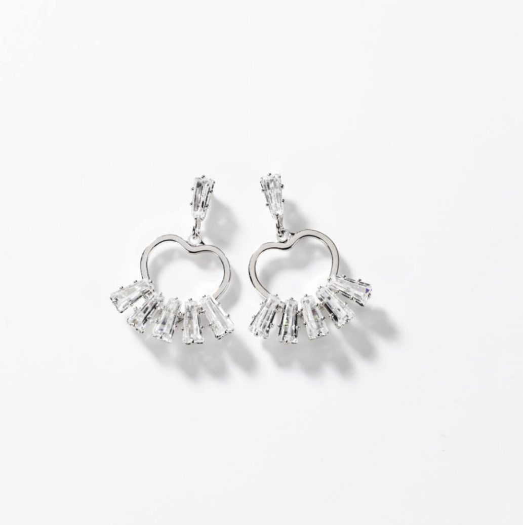 Ohrhänger bestehend aus einem dreieckigen, handgefassten Zirkonzirkon, aus dem sich die Form eines Herzens aus rhodiniertem Metall entwickelt. Das Herz ist an der Unterseite mit fünf Zirkonen verziert, die es zum Leuchten bringen.